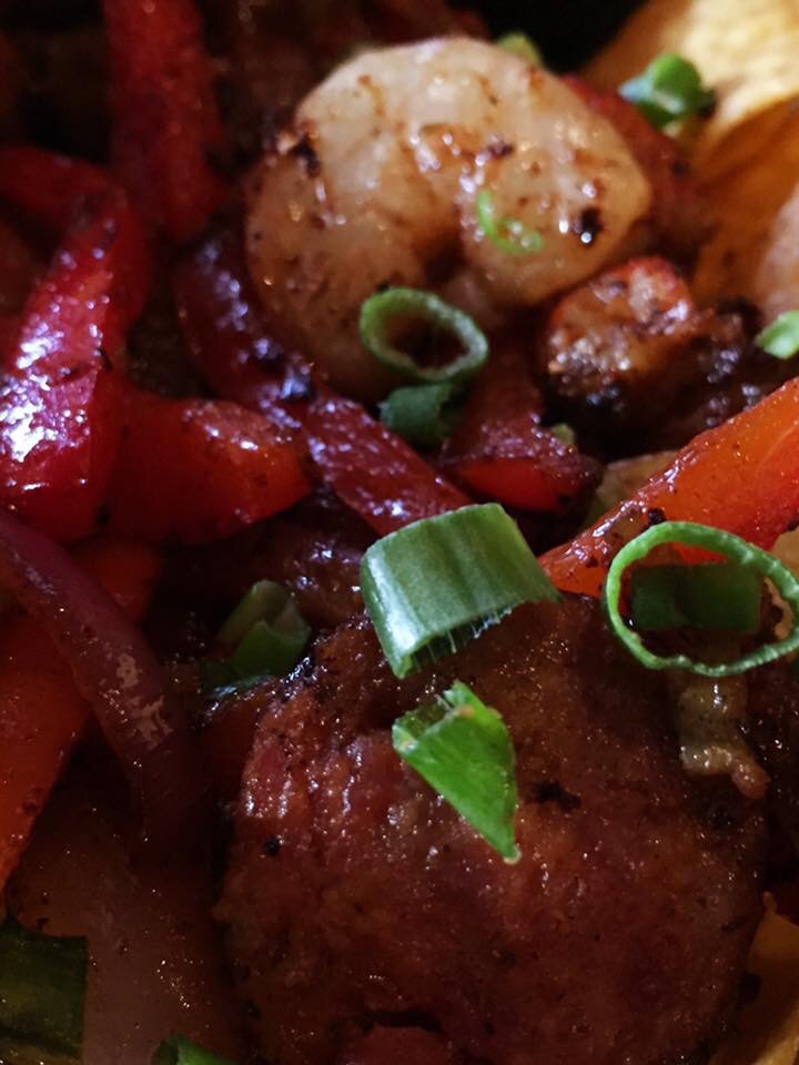 For my meal, I decided on their Bourbon Street Nachos. It’s listed in their starter section, but one person can make a meal of it. It’s chips loaded down with shrimp, crawfish, andouille sausage, sautéed red bell peppers, onions, and chives. And with a side of salsa and house made quest dip, let the party begin!