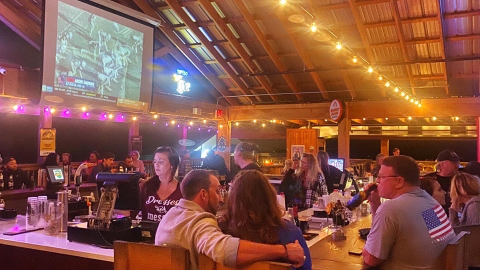 It’s a huge covered, rustic dining area. It appears to be almost twice the size of the restaurant with a stage up front and a second bar in the back with a huge overhead video projector. It was packed with folks watching the game on one end and the nights music, being performed by The Bonfire Orchestra, on the other.