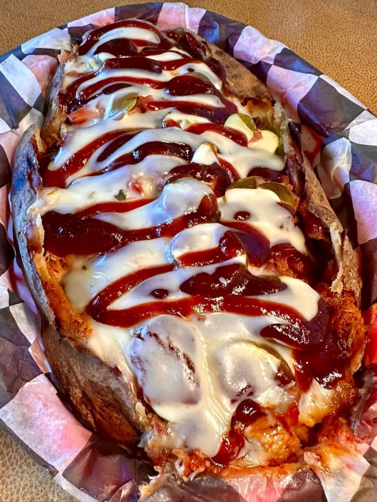 BBQ Spud – This BBQ potato is my new favorite! It’s a huge potato filled with finely pulled / chopped pork, white queso cheese, bacon, and jalapeños. The pork toppings provided by The Smoking Section. They supply custom Smoked Meats, Game Day Packs, Holiday Cooking, Custom Dry Rubs, Sauces & Sides to individuals and local restaurants.