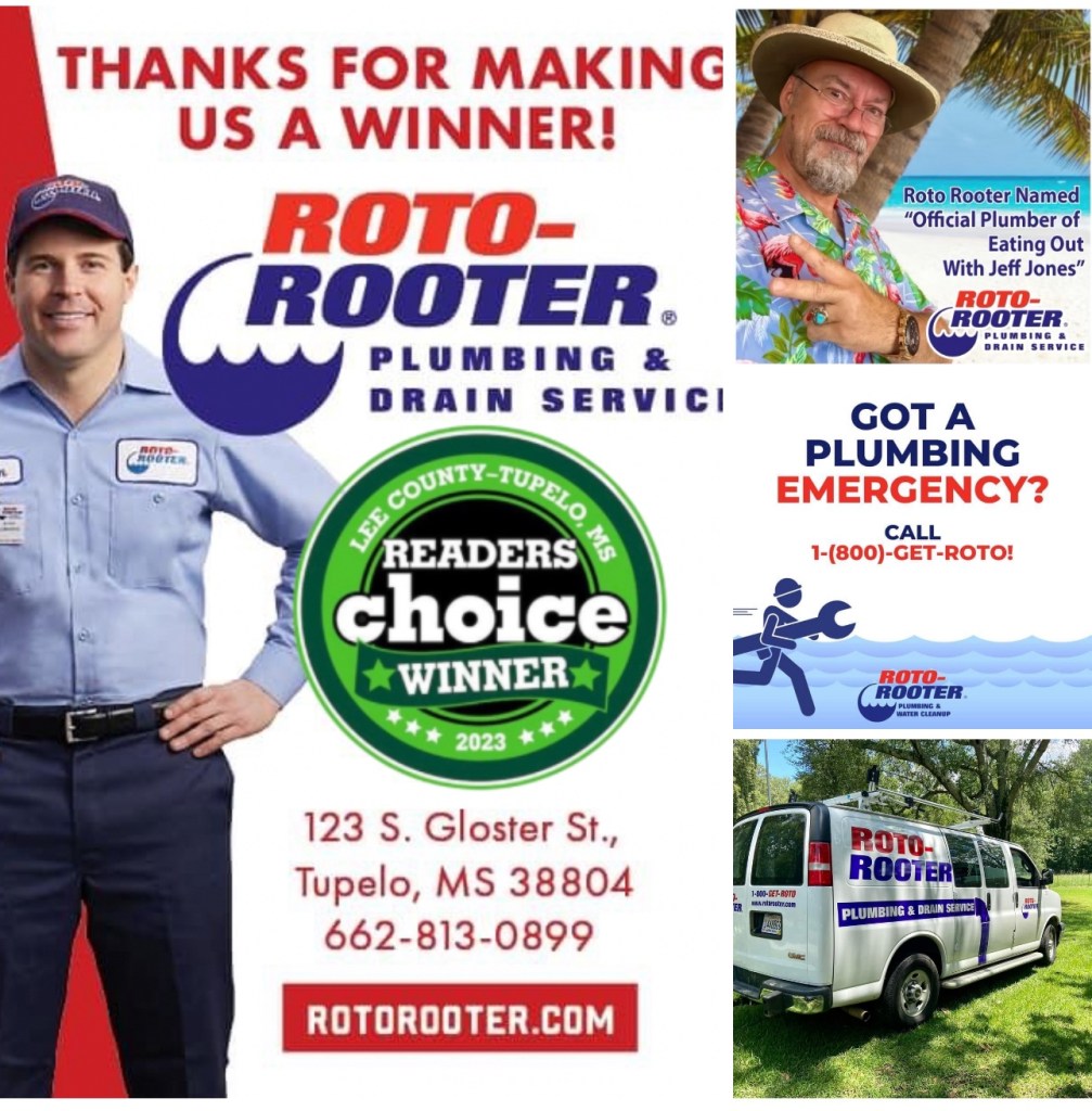 - ⁃ 🎉NEW SPONSOR🎉 Roto-Rooter (Tupelo/Oxford) serves Northeast Mississippi with 24/7 plumbing services for businesses and residential customers. They were recently named Best Plumber by the Reader’s Choice Awards of the Northeast Daily Journal for Tupelo and Lee County, GOT a pluming EMERGENCY? CALL 1-(800)-GET-ROTO