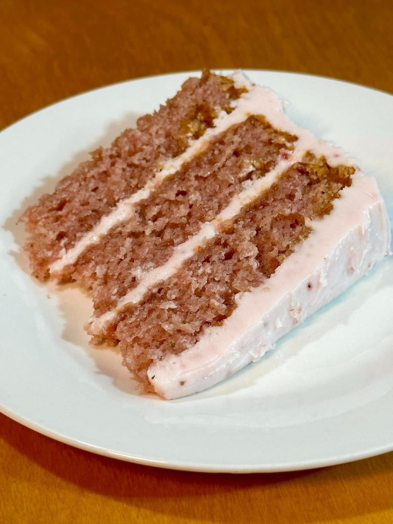 The cake had three layers that were not only moist, but soaked in flavor to match the fragrance of its strawberry frosting.