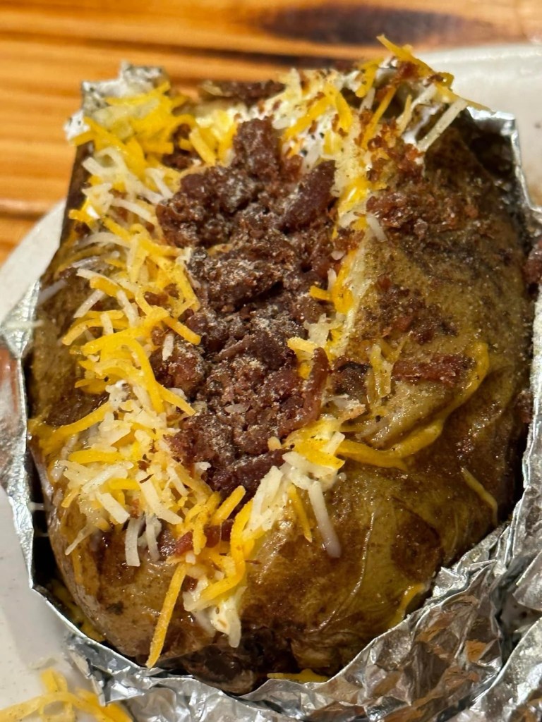 🔥 Loaded Baked Potato – I could have made a meal of this and been a happy camper! People notice the details even if they don’t mention it sometimes. When I saw my Loaded Baked Potato I had to brag on it immediately! When it arrived to my table, the foil had already been carefully peeled back, the potato split and each topping expertly layered, by the time I started digging in, the cheese was already melting and the sour cream already soaking into the pores of the potato! The salted thick bacon pieces was an excellent addition and duly noted!!