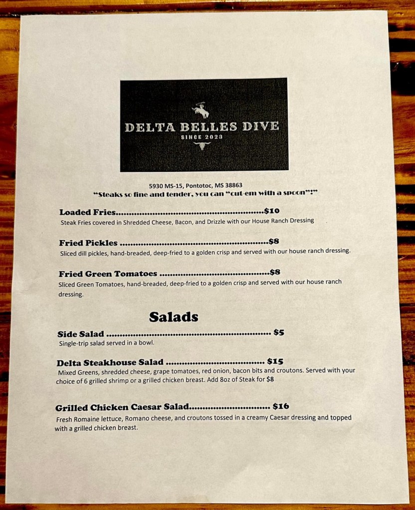 Delta Belles Dive is located across from Ashley Furniture in Ecru. They offer a lunch menu with some quick cafeteria style plate lunch options, and a delicious dinner menu for a leisurely evening.