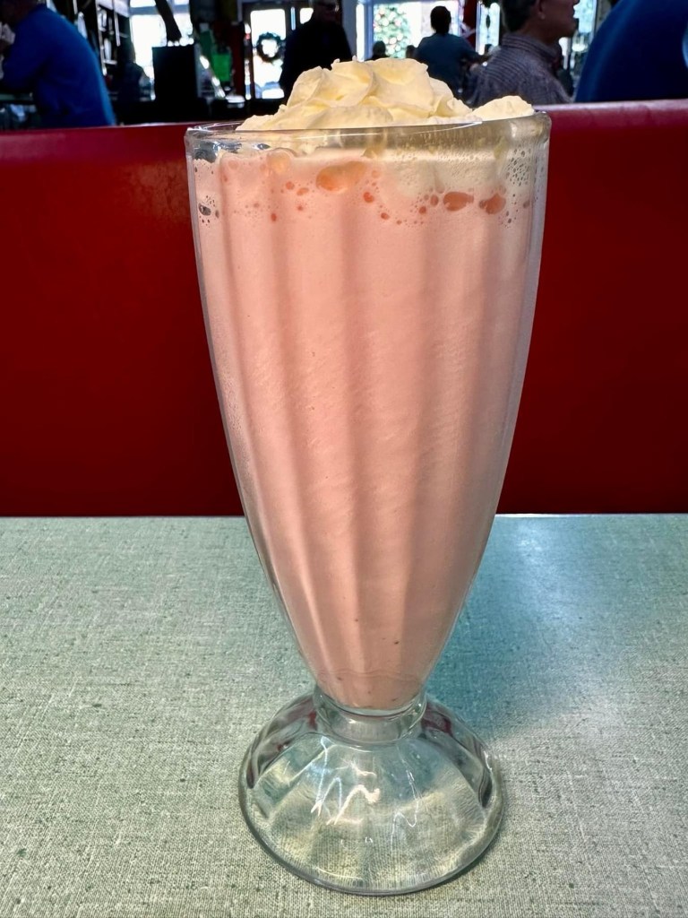 The Strawberry Milkshake is perfect for pairing with a burger or as a decadent treat! Whether you’re looking for a tasty drink to complement your favorite burger or an indulgent treat to savor after your meal, the Strawberry Milkshake is the perfect choice. Served in a glass with a metal mixing cup, you’re sure to enjoy every last drop. Plus, there’s usually enough left over in the cup for a second serving!