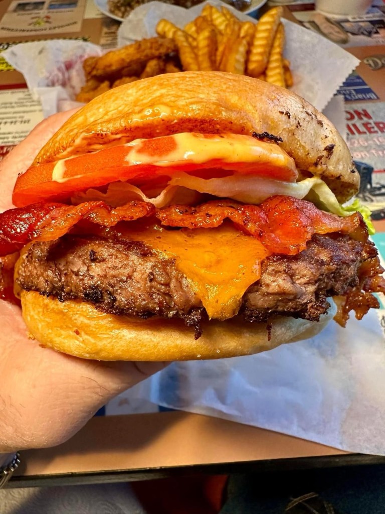 Doug’s Burger is a mouth-watering masterpiece, crafted to perfection with a blend of chuck, brisket, and short rib beef. Served on a sourdough bun with bacon, lettuce, tomato, cheddar cheese, and comeback sauce, this burger is a prime example of their award-winning menu.