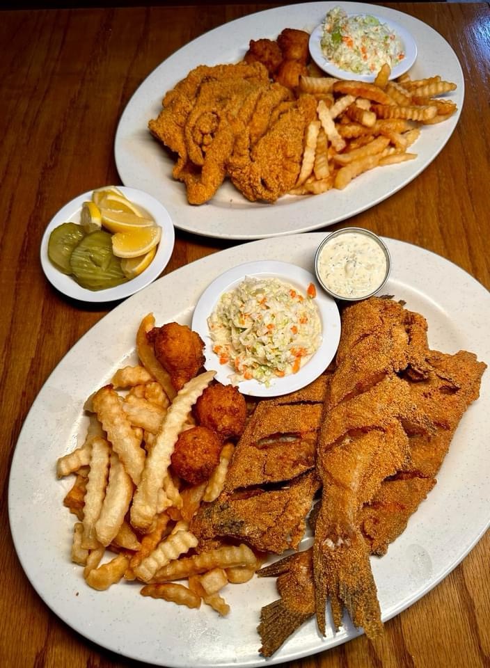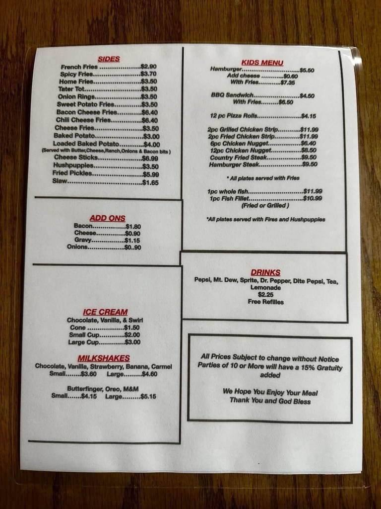 The Tin Top Grill offers most anything you could ask for from a small-town restaurant and then some. Just to name a few favorites, breakfast platters, milkshakes, snow cones, burgers, BBQ, chicken, oysters, catfish, salad bar, and a hot bar for quick plate lunches during the week.