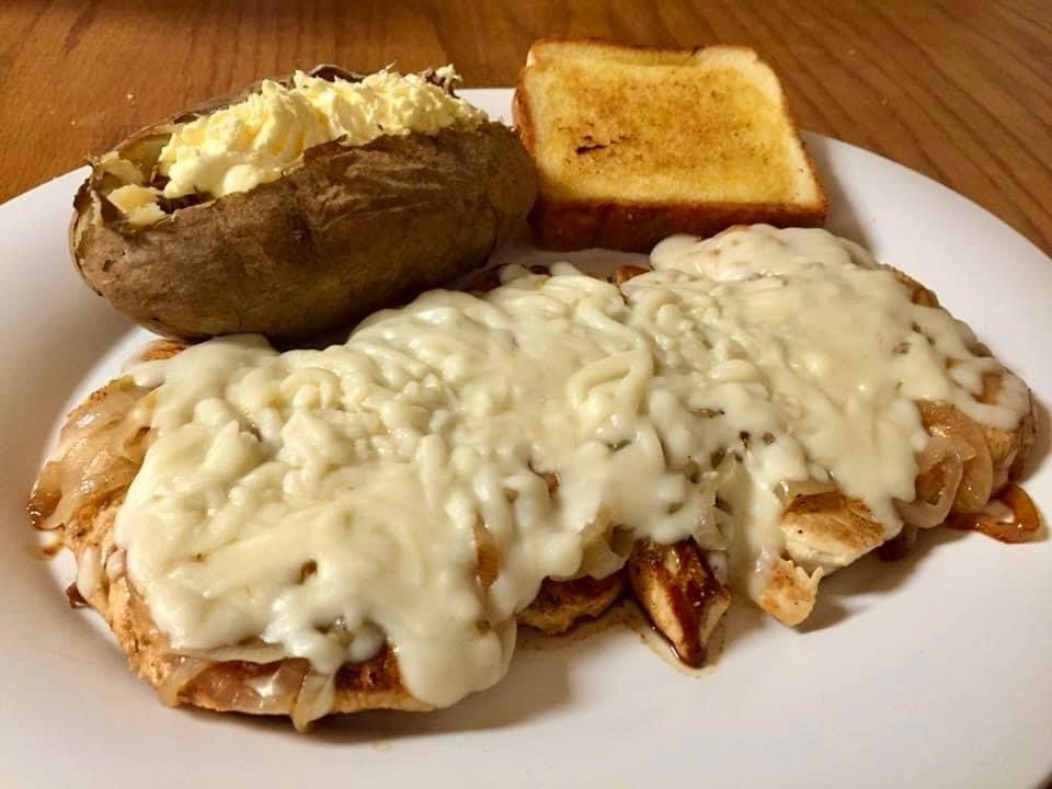 The Large Chicken Cluck is a Tin Top Grill original. If you’re looking for a mouth-watering meal, the Large Chicken Cluck is a must-try! It’s five juicy white meat chicken strips, topped with a generous amount of melted mozzarella cheese, and smothered in sautéed onions. Paired with a salad, choice of potato, and garlic toast, it’s definitely a savory and satisfying meal!