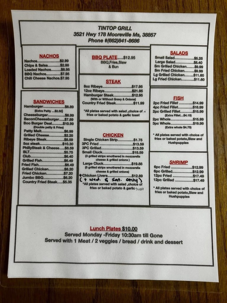 The Tin Top Grill @ 3521 Highway 178, Mooreville, MS. They have been serving the community for over a decade. You can place an order and pick up at the convenient window, or dine inside for a relaxing meal.