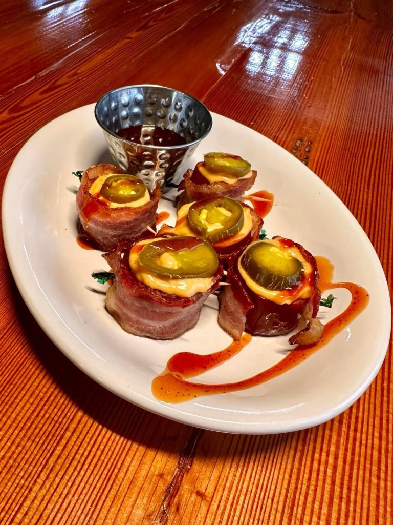 🔥 Pig Shots – this is a very meaty appetizer and definitely sharable! It’s smoked sausage wrapped in bacon topped with cheese, topped with jalapeño and drizzled with bbq sauce.