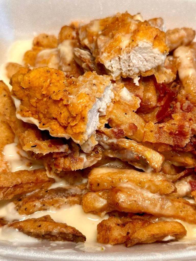 🔥The Hen’s Nest – This is a plate full of their award winning Fat Boy Fries, crumbled crispy bacon, Johnny’s hand breaded double dipped chicken tenders, all smothered in melted queso cheese.