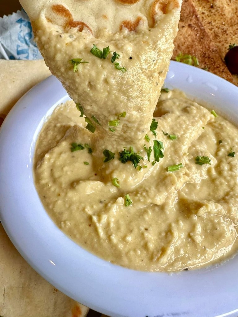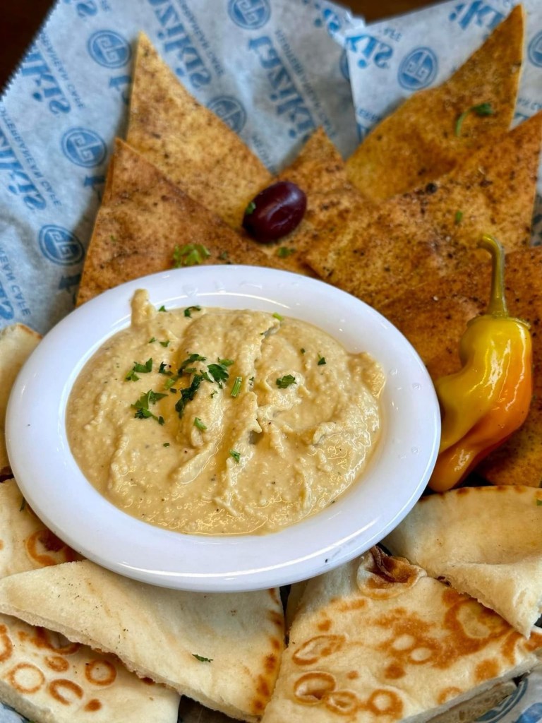 Starting with a serving of creamy hummus is always a great start to your culinary trip to the Mediterranean. Choose hard pita chips, soft, or both for dipping!