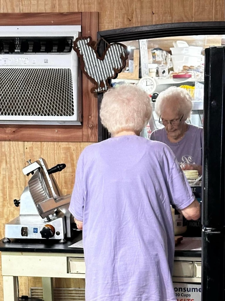 During my visit, the store/restaurant was filled with locals and area workers taking a lunch break. With a quick peek in the kitchen, I saw a former classmate, Michelle, lining up plates of meatloaf, veggies, and cornbread, while Ms. Geraldine was at the meat slicer preparing our sandwiches.