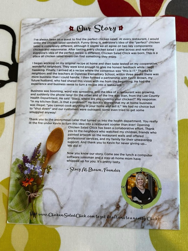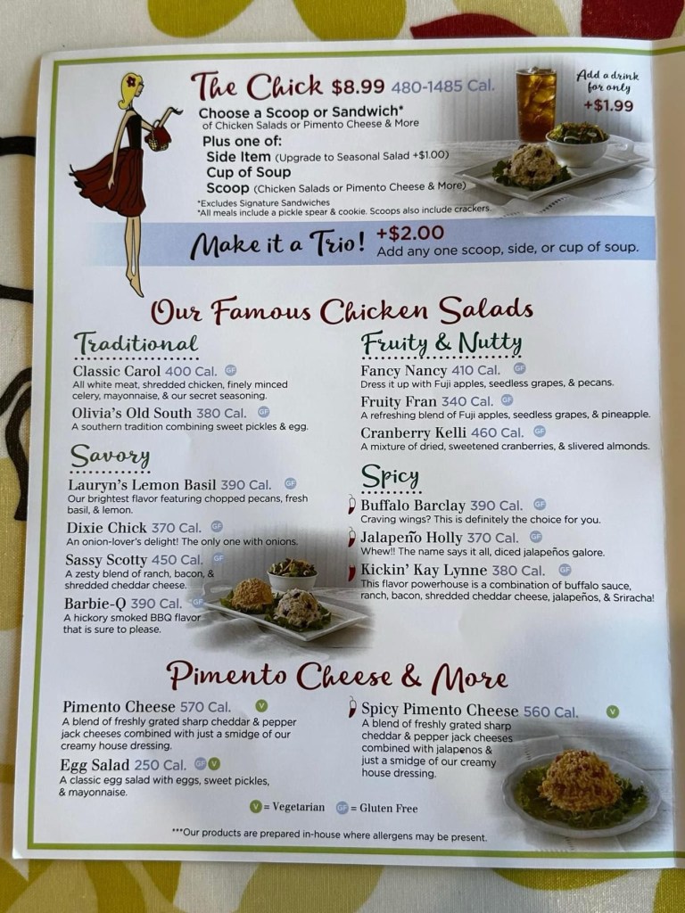 They have a great backstory, beautiful decor, relaxing dine in atmosphere, patio dining, drive thru, catering, online ordering, and local delivery. And NOW a new Chicken Salad Chick Patty Melt!