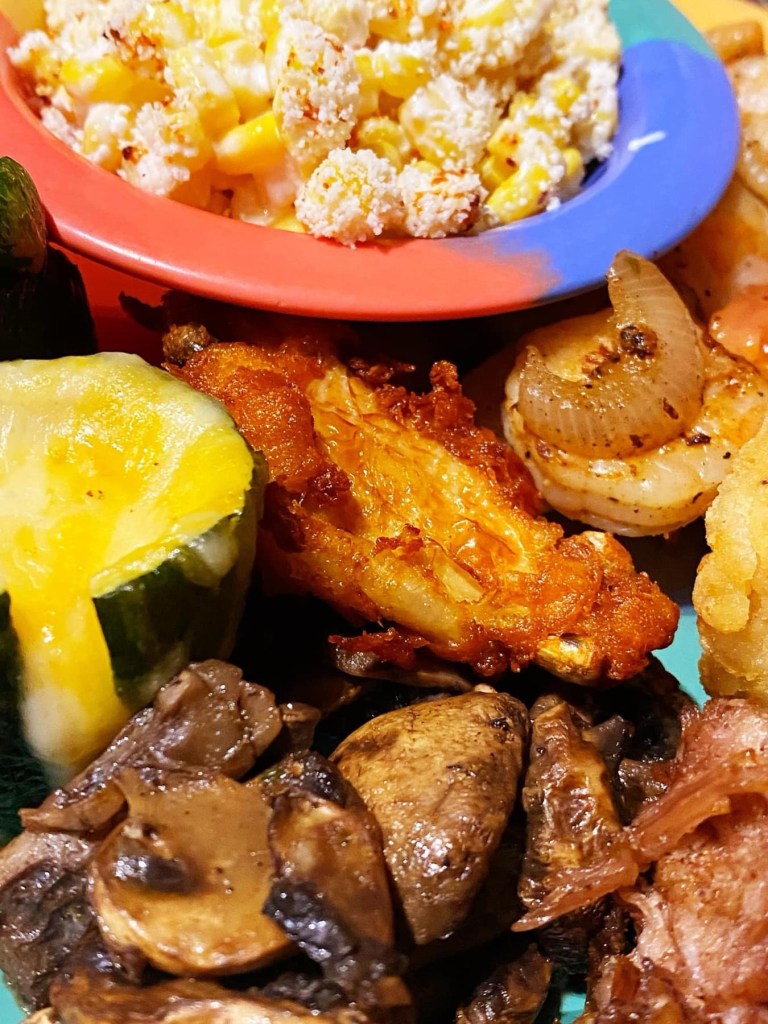 One welcomed surprise was Mexican Street Corn! For those that love this as much as I do, and newbies, Mexican Street corn can be served in a bowl or still on the cob. One recipe for this south of the border delicacy includes coarse salt, Mayo, Queso Fresco, cayenne pepper, and maybe some other special ingredients. Whether on the cob or in a bowl, this is the FIRST EVER I’ve seen on a buffet! Go get y’all some!