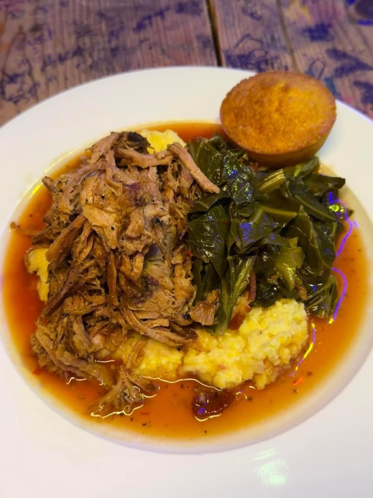 For my main course the Pork & Greens are slow beer braised pulled pork kissed with a Carolina style barbecue sauce and their “kickin” greens served over a huge pile of cheesy grits. Let me start with this…I’d never ate greens, never liked the thought of eating greens, BUT…because the greens are sautĂ©ed and infused with such a unique tangy ness, it was a perfect compliment.