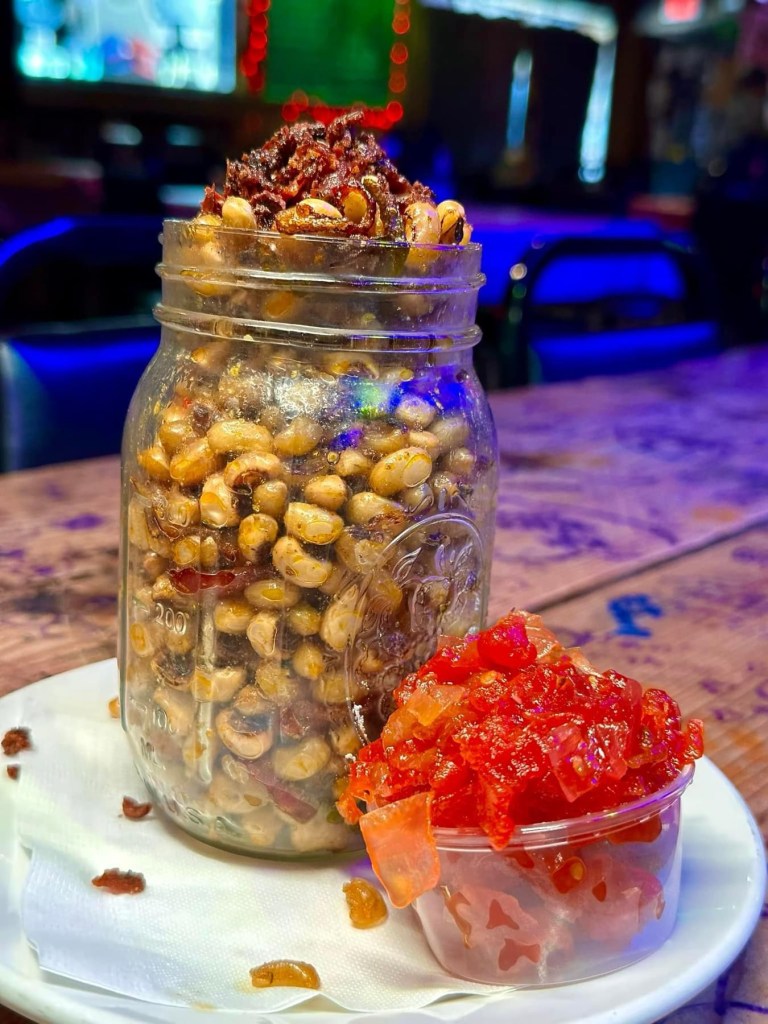 The Fried Black Eyed Peas are lightly fried and tossed with old bay seasoning. It comes in a Mason jar topped with bacon and a side of sweet relish. Now, their is no right or wrong way to eat this, you can pour some peas on the plate and then mix some relish in with it or my favorite is to scoop a bit relish then peas for a perfect bite!