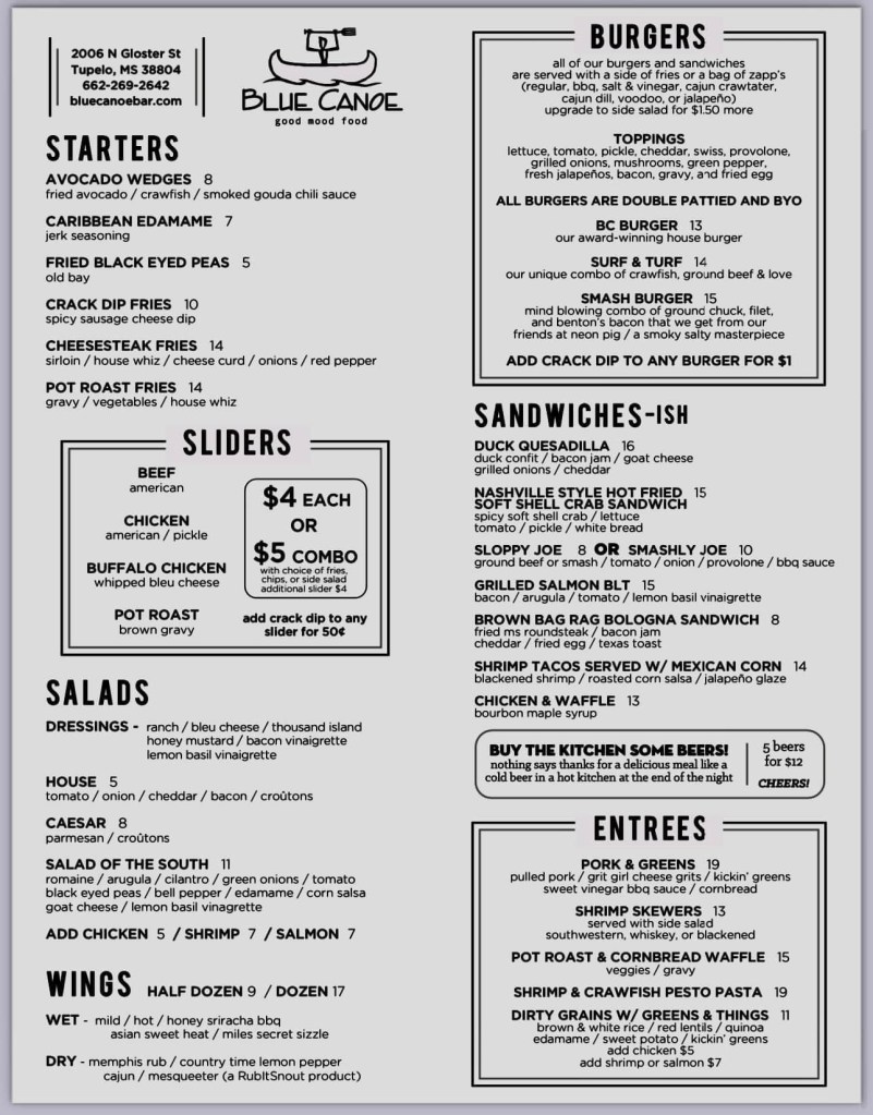 Blue Canoe @ 2006 N Gloster St, Tupelo, MS. Good Mood Food! Grits, pork, greens, and black eyed peas never tasted so good!