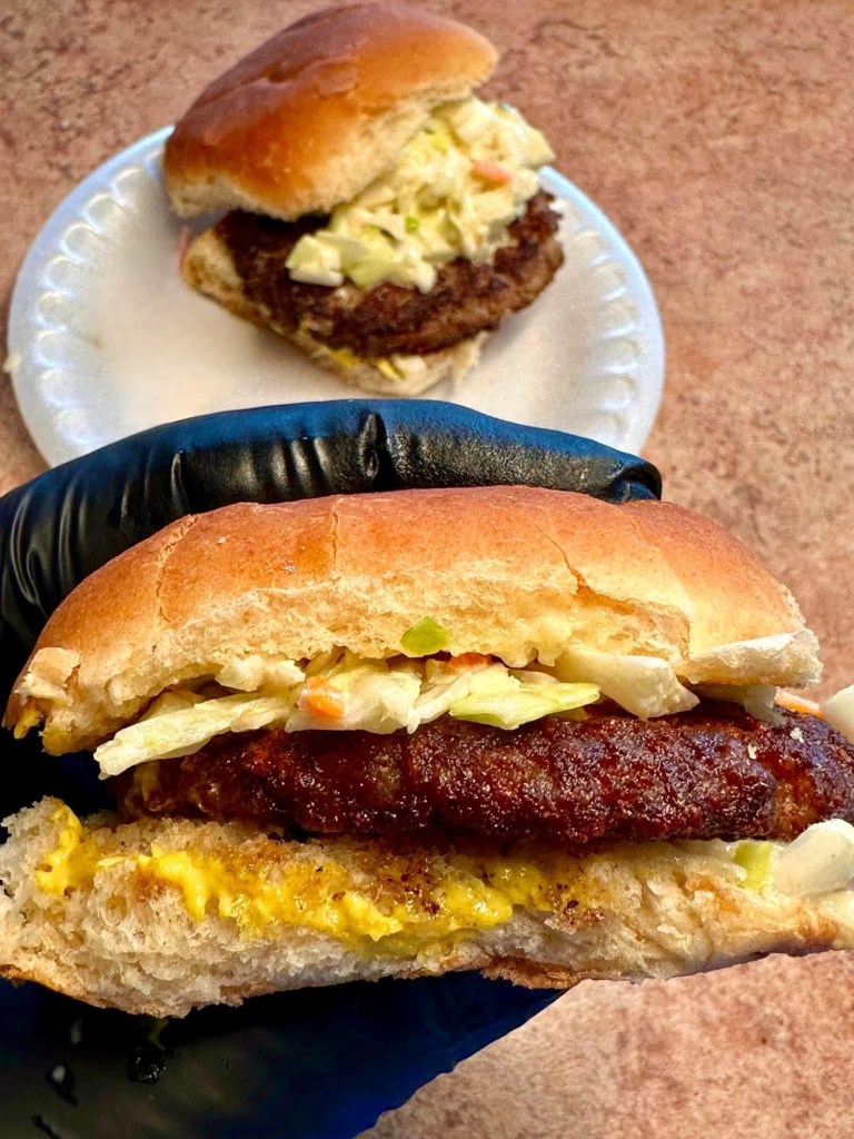 I wasn’t exactly sure what to expect but it’s actually quite simple. It’s thin cut, grilled crispy sausage patties on a dinner roll, topped with coleslaw and mustard. Ya’ll, this was surprisingly delicious! It’s like one of the best sliders I’ve ever had. One of the other customers sitting near me said that he has ordered many of them with slightly different toppings.