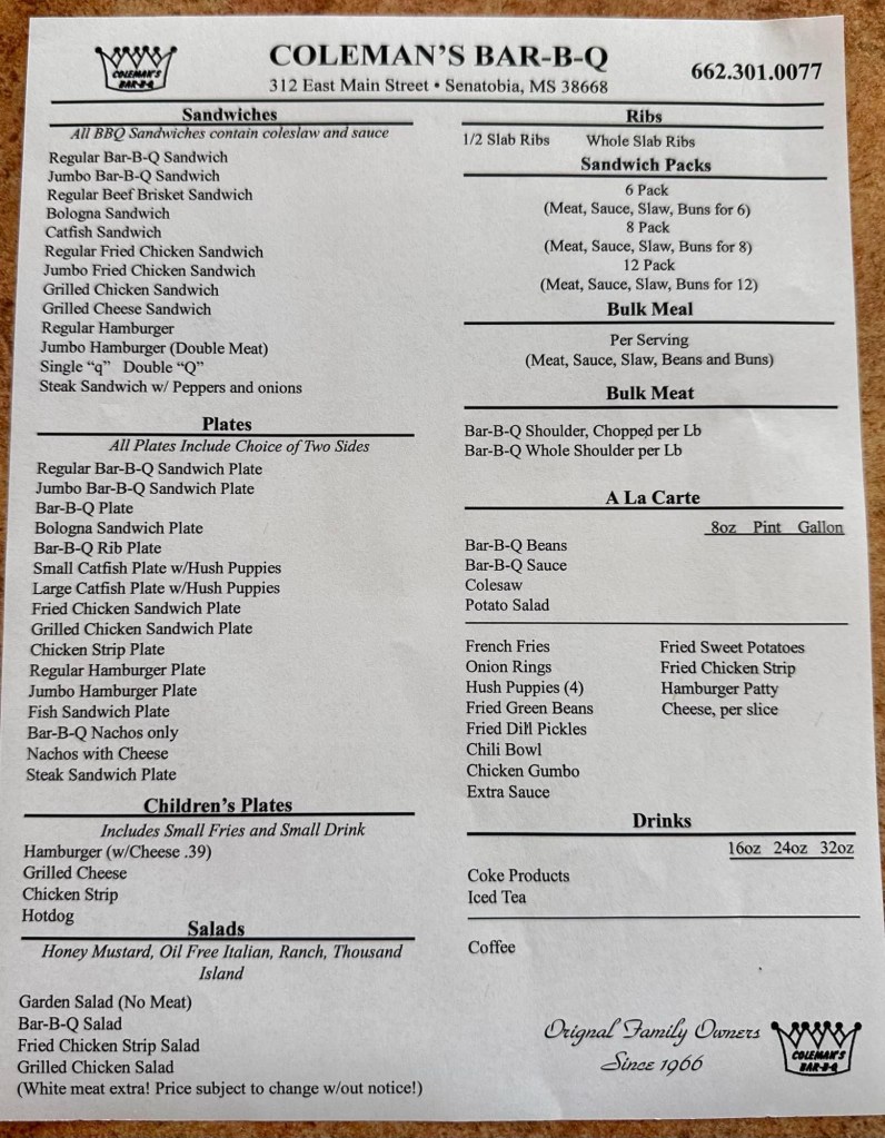Although it’s the last remaining Coleman’s Bar-B-Q restaurant, its popularity is unwavering in its hometown of Senatobia and surrounding areas! During my visit, there was a steady stream of folks ordering menu favorites that many of us haven’t enjoyed in quite a while.