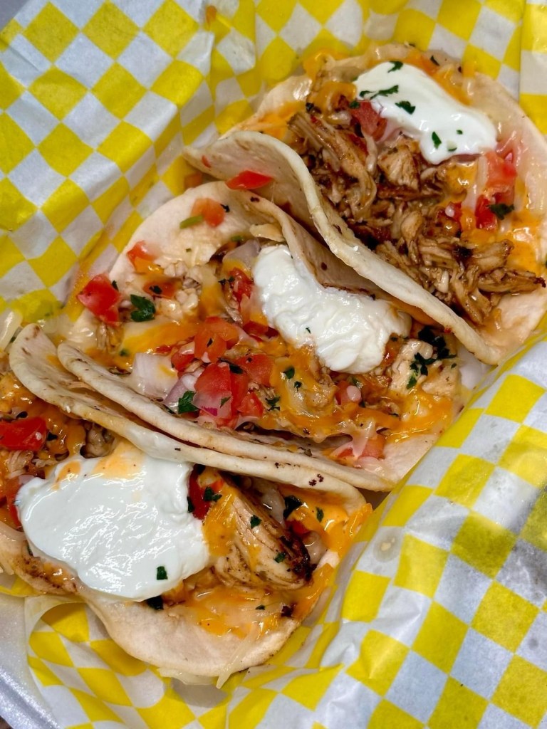 The chicken street tacos are pretty much loaded and ready to eat and enjoy with chicken, pico do gallo, garlic Parmesan, ranch, and cilantro on soft shells.